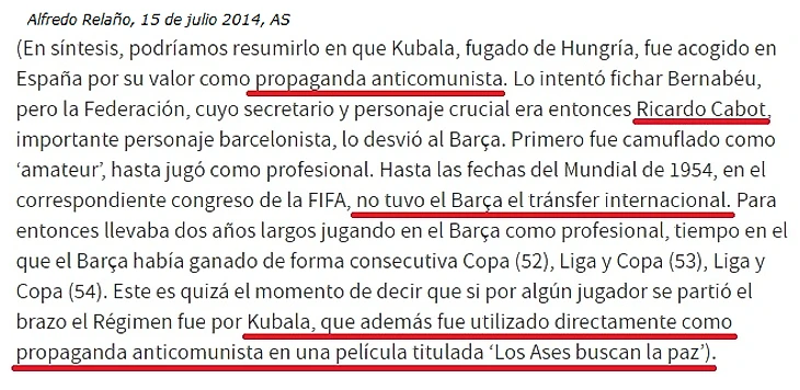 1950 год. «Барселона» подписывает Кубалу, одного из лучших игроков в Европе в то время. Режим Франко и федерация футбола Испании помогли клубу с оформлением этого трансфера. Секретарем федерации на тот момент был Рикардо Кабо, связанный с «Барсой» и сыгравший большую роль в том, чтобы Кубалу национализировали в кратчайшие сроки.