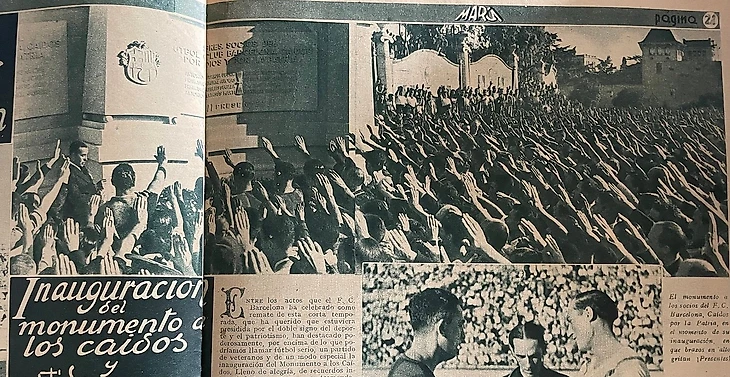 1939 год. Конец гражданской войны в Испании, приход к власти режима Франсиско Франко. В том же году у входа на тогдашний стадион «Барсы», «Лес Кортс», устанавливают мемориал павшим в гражданской войне. По окончании каждого сезона игроки и сосьос команды подходили к этому. месту для исполнения, как это называют в Испании, el saludo franquista. Франкистское приветствие.