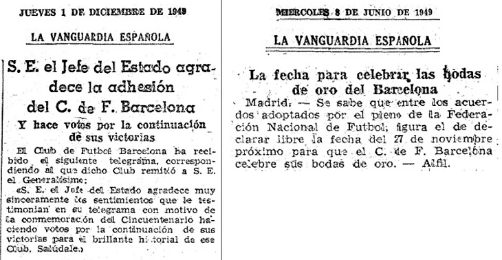 1949 год. Футбольный клуб «Барселона» отмечает 50-летие. Федерация откладывает проведение матча Ла Лиги и объявляет 27 ноября свободной датой для «Барсы», чтобы они отметили свой юбилей. Франко отправляет «Барсе» телеграмму с поздравлением и желает ей дальнейших побед.