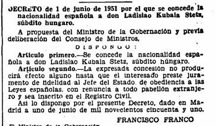 Уже 1 июня 1951 года Франсиско Франко предоставил ему испанское гражданство.