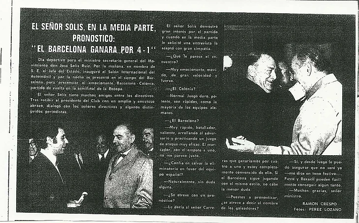1969 год. Интервью франкист Хосе Солиса Руиса на «Камп Ноу». Солис был еще одним министром при Франко, а ранее играл важную роль во время гражданской войны и был известным сторонником «Барсы». «У меня много друзей среди руководства клуба».