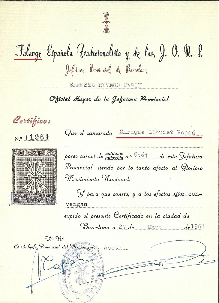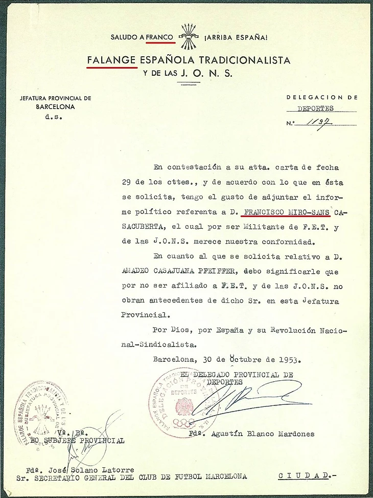1953 год. Франсеск Миро-Санс избран президентом футбольного клуба «Барселона». Документ на фото взят из Каталонской федерации футбола и он доказывает принадлежность нового президента «Барсы» к правящей партии «Фаланга», лидером которой и являлся Франко.