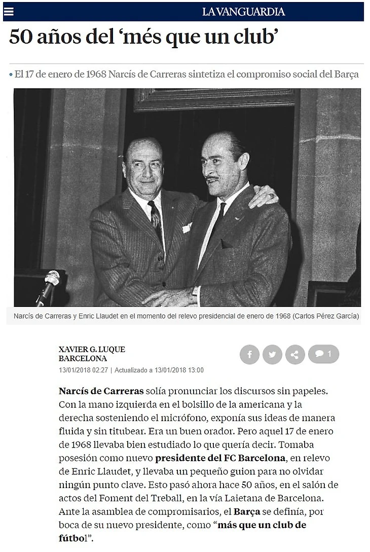 Девиз, который сегодня торжественно красуется «Камп Ноу» - «Més que un club» (больше, чем клуб), берет свое начало с речи франкиста Нарсиса де Каррераса во время его инаугурации на посту президента «Барсы».