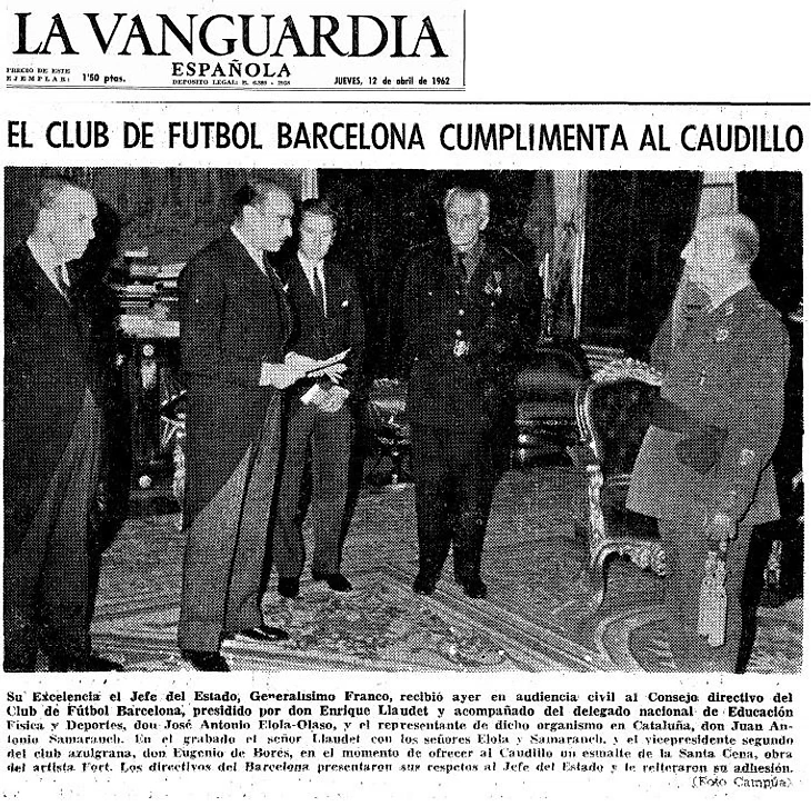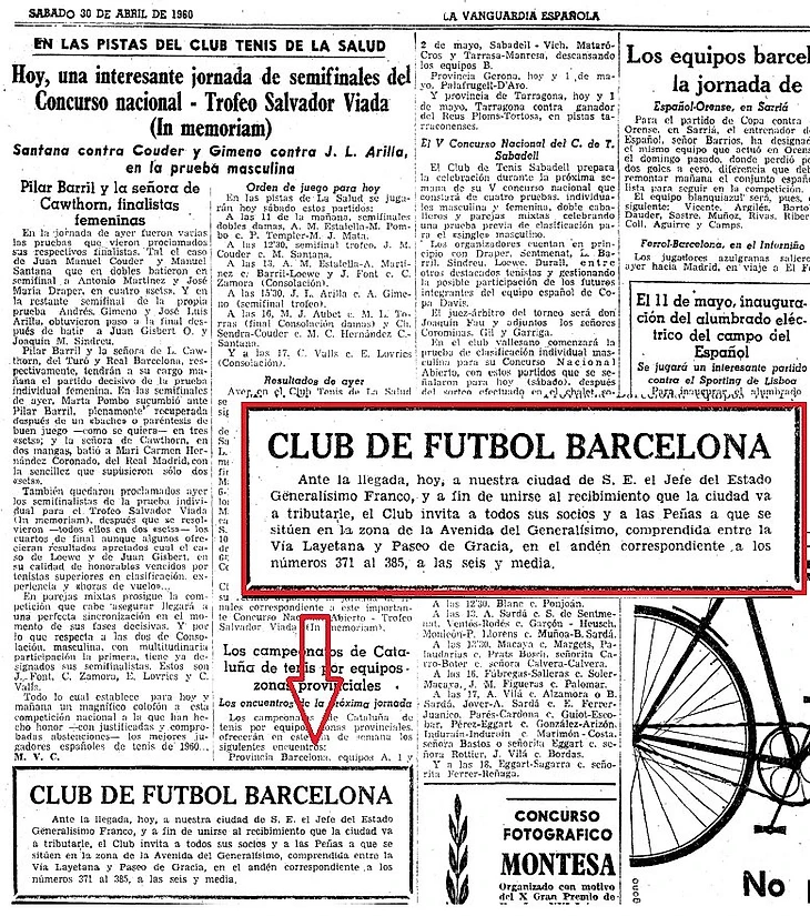 1960 год. Новый обращение футбольного клуба «Барселона» через газету La Vanguardia, с призывом к сосьос и и болельщиков клуба встретить и сопровождать Франко во время его визита в город Барселона. К примеру, тот же «Эспаньол» ни разу не делал заявлений подобного рода.