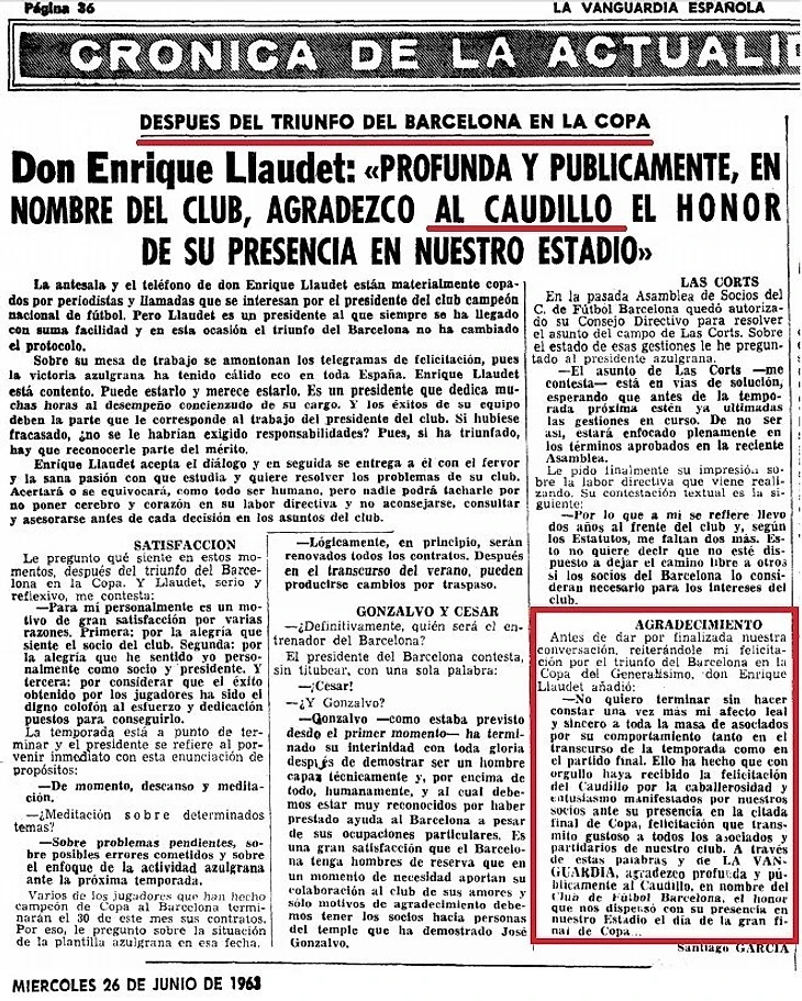 1963 год. Каталонская команда снова выигрывает Кубок Генералиссимуса. Президент «Барсы» Энрике Льядует публично и от имени клуба благодарит Франко.