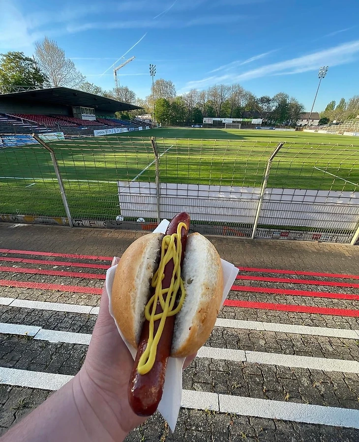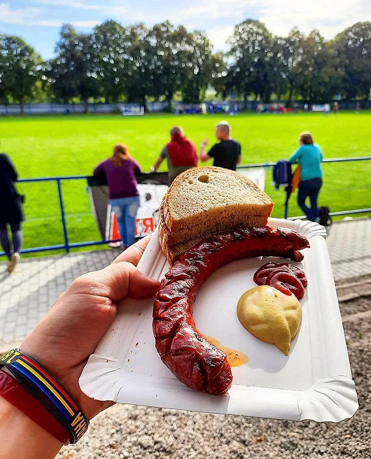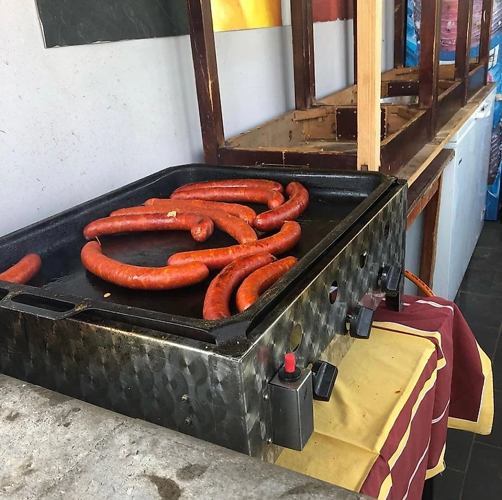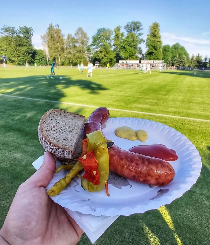 Колоритный дедушка жарит колбаски прямо на стадионе и запах по ветру просто пропитывает болельщиков. Ну вот, как в такой ситуации не сорваться и не потратить 2 еврика? Приготовленное на углях, такое блюдо дарит неповторимый вкус. Держат их, пока сок внутри колбаски не начнет кипеть.