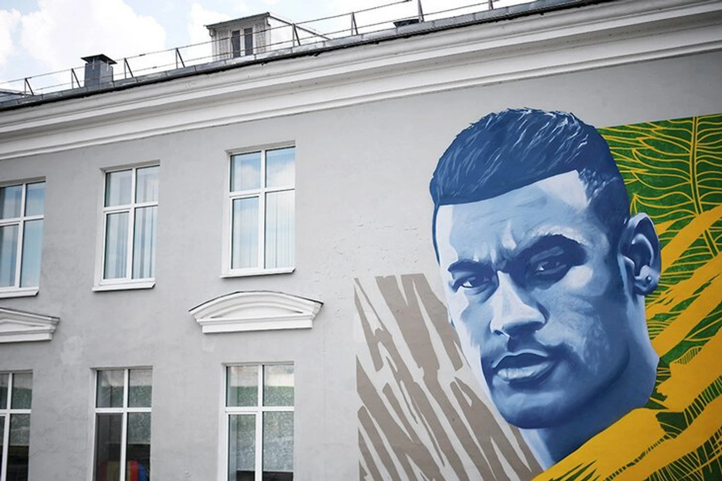 Волжский Пеле в исполнени художника Алексея Каллима получился молодым и не таким загорелым. Но весьма техничным: