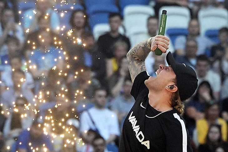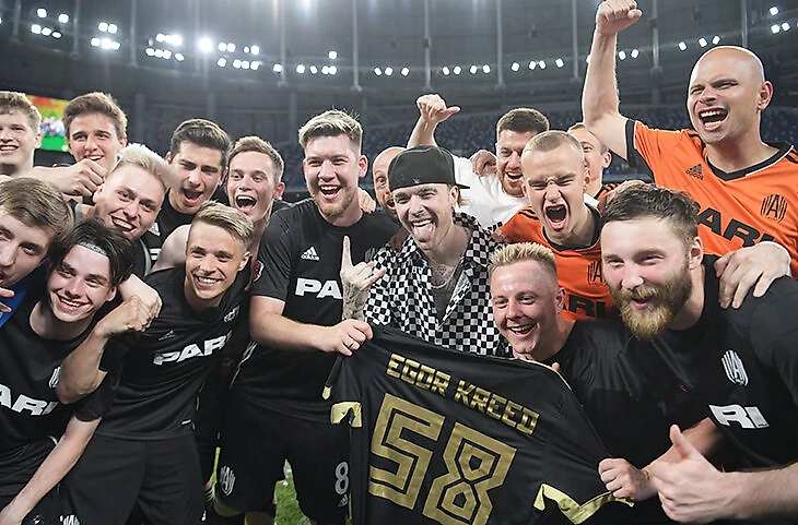 Егор Крид перед матчем развлекал футболистов и зрителей, да и сам кайфовал от процесса. Например, посвящал песни друзьям: пел «Цвет настроения черный» вместе с Филиппом Киркоровым (он подпевал с трибуны) и мотивировал «Амкал».