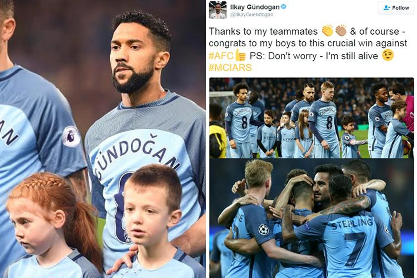 Илкаю Гюндогану пришлось написать твит, дабы заверить болельщиков, что он не умер. Это последовало за данью уважения от игроков «Манчестер Сити», которые предложили Гюндогану свою поддержку, надев футболки с его именем после того, как игрок получил травму колена во время победы «Сити» со счетом 2:0 над «Уотфордом» в декабре 2016 года.