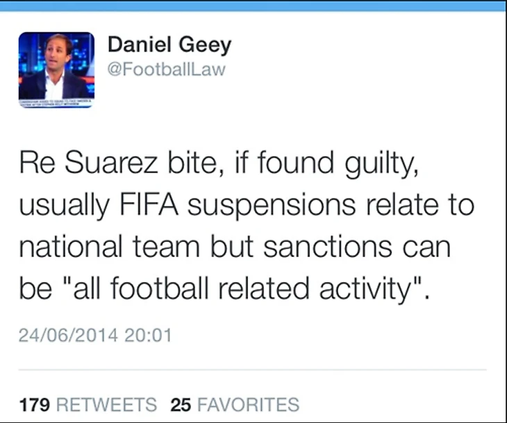 До того, как была наложена дисквалификация, я затвитил, что всегда существует возможность дисквалификации Суареса на любую деятельность, связанную с футболом, потому что Дисциплинарный кодекс ФИФА прямо предоставляет ФИФА такую возможность.