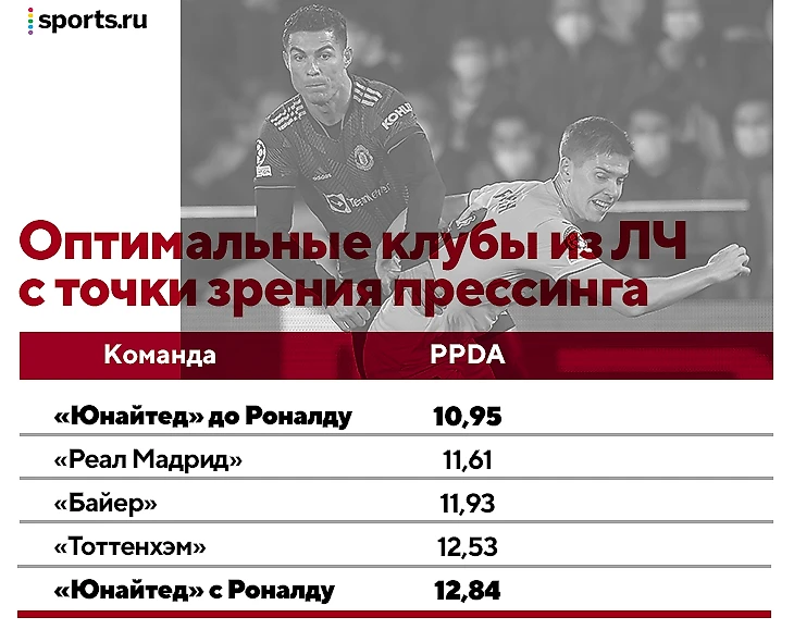 Давайте оттолкнемся от этого, анализируя потенциальные клубы для Криштиану. Из клубов ЛЧ от топ-5 лиг наименьшая интенсивность прессинга у «Реала», «Байера» и «Тоттенхэма». При этом даже их результат лучше, чем у «Юнайтед» последнего сезона. Глобально это лишь подтверждает тезис о том, что в той или иной степени прессинг важен всем большим командам: