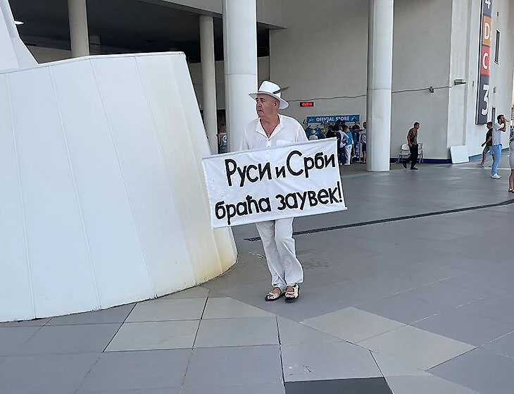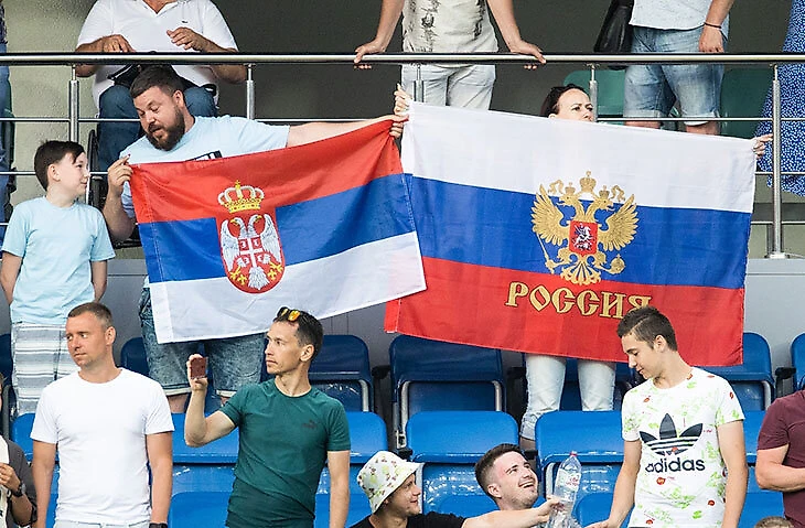 Еще одна тема вечера – отношения России и Сербии. У «Фишта» можно было встретить баннеры о близости стран и флаги Сербии.