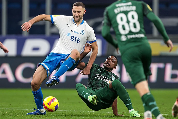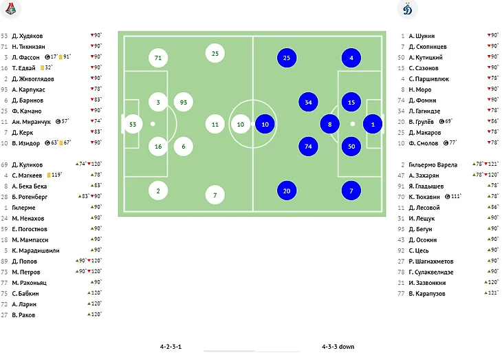 «Локомотив» — «Динамо» — 3:3 (1:0) 10.07.2022 (воскресенье). Начало – 19:00. Москва. Стадион «РЖД Арена». «Локомотив»: Худяков (М.А.Гильерме, 90+1), Живоглядов (М.Ненахов, 90+1), Едвай (М.Мампасси, 90+1), Фассон (К.Марадишвили, 90+1), Миранчук (Д.Куликов, 74. С.Бабкин, 90+31), Баринов (Б.Ротенберг, 84. М.Петров, 90+1. А.П.Ларин, 90+31), Тикнизян (Е.Погостнов, 90+1), Карпукас (С.Магкеев, 78), Камано (Д.Попов, 90+1. В.Раков, 90+31), Керк (А.Бека Бека, 84), Изидор (М.Раконьяц, 90+1). «Динамо»: Шунин (И.Лещук, 90+1), Паршивлюк (Г.Варела, 77. В.Карапузов, 90+29), Скопинцев (Цесь, 90+1), Сазонов (Р.Шагиахметов, 90+1), Кутицкий (Д.Осокин, 90+1), Фомин (Д.Бегун, 90+1), Грулев (Д.Лесовой, 84), Моро (Г.Сулаквелидзе, 90+1), Макаров (А.Захарян, 77. И.Зазвонкин, 90+28), Гагнидзе (К.Тюкавин, 77), Смолов (Я.Гладышев, 77). Голы: Фассон, 17 (1:0). Миранчук, 57 (2:0). Изидор, 69 (3:0). Грулев, 69 (3:1). Смолов, 77 (3:2). К.Тюкавин, 90+21 (3:3). Предупреждения: Едвай, 32. Изидор, 67. С.Магкеев, 90+29.