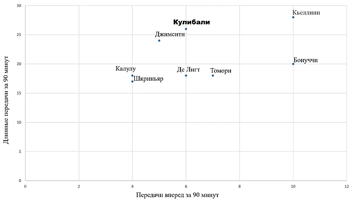 1. Владение мячом. Кулибали делает 61 передачу за 90 минут. Это 4 показатель по лиге. Лучше него только Ачерби (72.5), Джанмарко Феррари (65) и Амир Рахмани (62). Из этих 61 передачи Калиду делает 26 передач вперед (1 показатель в лиге), 33 паса в стороны и только 2 передачи назад. Точность передач 87% (11 показатель в лиге)