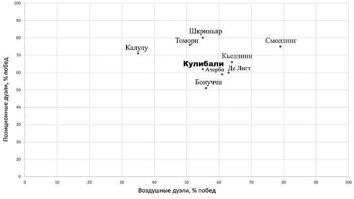 2. Эффективность в дуэлях. Учитывается два показателя: воздушные дуэли и позиционные дуэли. Анализ проведем по двум ключевым показателям: количество воздушных и позиционных дуэлей на 90 минут и процент побед в дуэлях на 90 минут