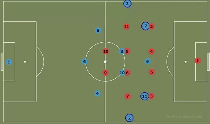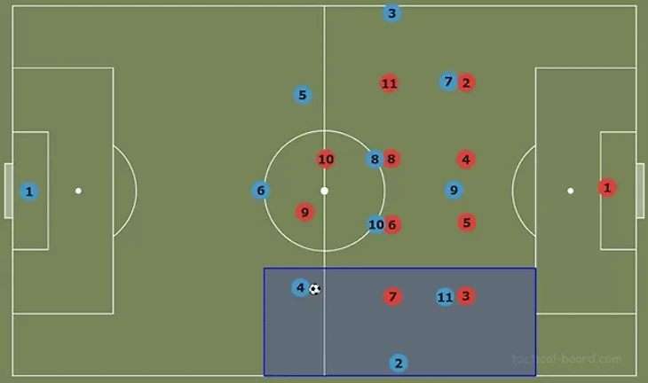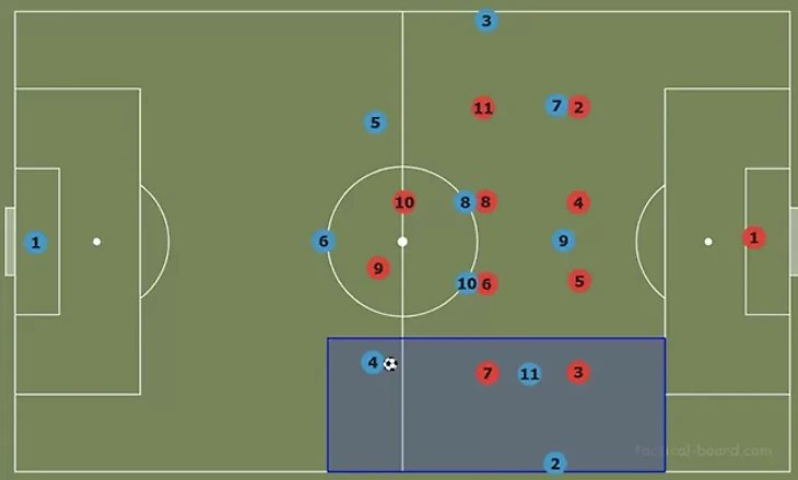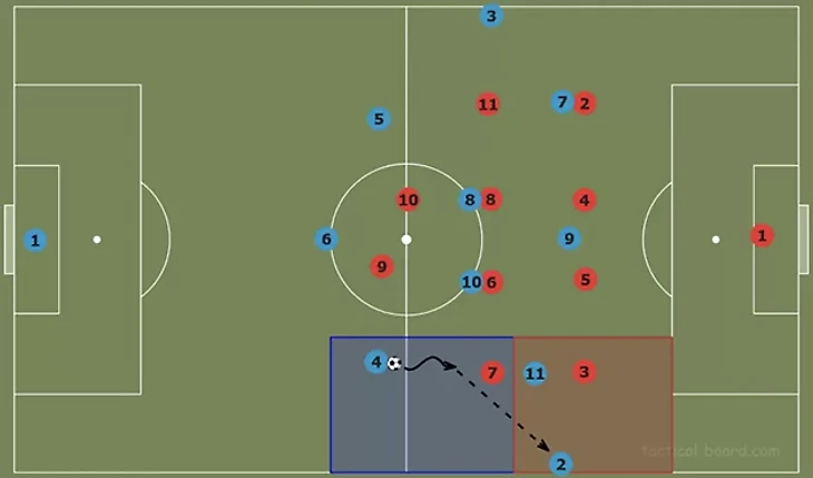 В эпизоде, как на картинке выше, в случае, если центральный защитник отдаст пас из точки, где он располагается сейчас, соперник получит выгодную для себя ситуацию 2v2 (седьмой и третий номера против наших второго и одиннадцатого). Рывок крайнего нападающего за спину защитника будет контролироваться крайним полузащитником соперника. Такое условие для нас проигрышное.