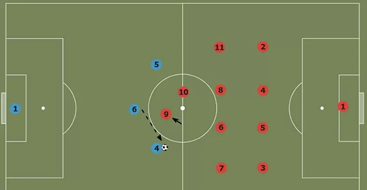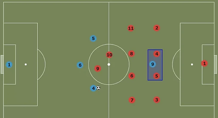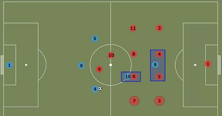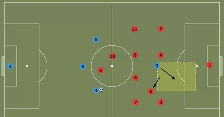 На этот раз девятый номер сделал шаг вперед, чтобы прессинговать центрального из нашей тройки, оставив четвертого номера открытым для получения мяча от шестого номера. Здесь реализована концепция создания «свободного игрока»: