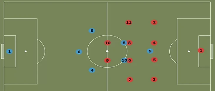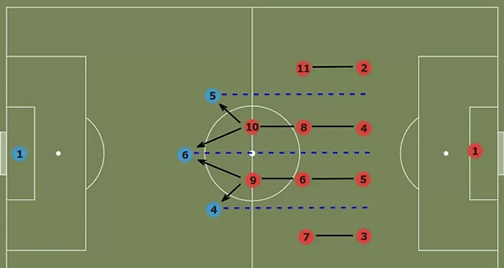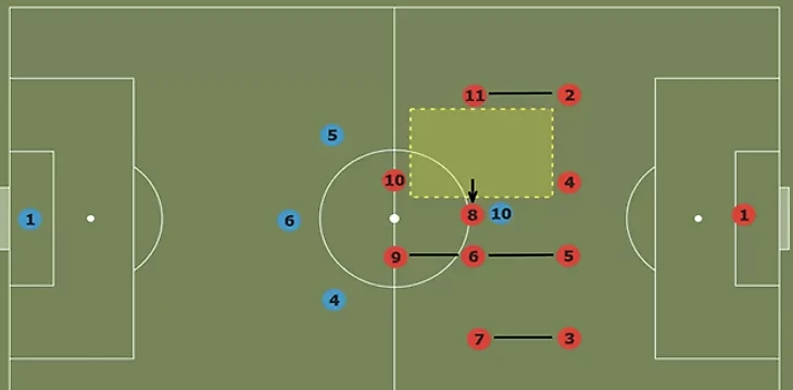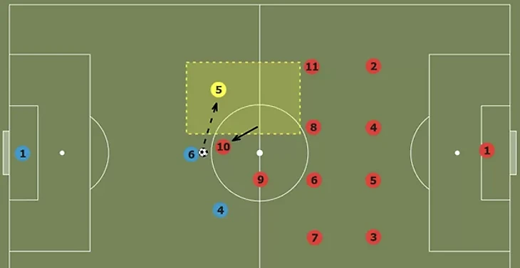 На рисунке ниже мы видим, как один из полузащитников вынужден разрушать структуру, чтобы перекрыть линию передачи от номера шесть к номеру десять. Этим движением он создает пространство в освободившейся зоне. Это пример того, как использование тройки при билдапе может немедленно создать пространство без применения ротаций по позициям: