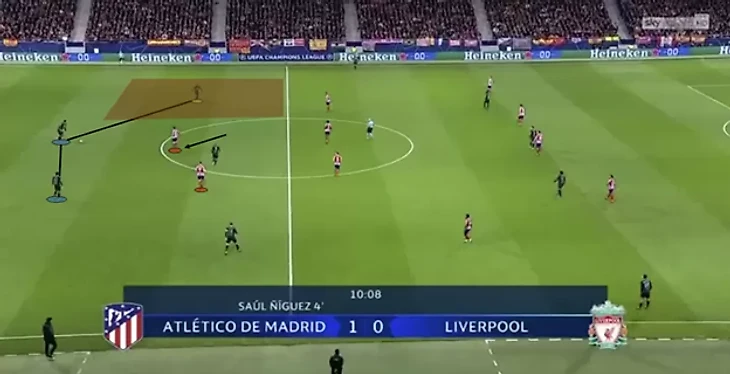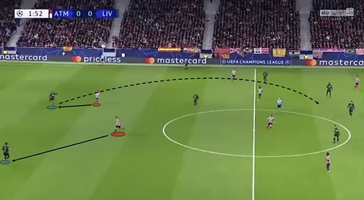 Здесь мы видим, как «Ливерпуль» играет с парой центральных защитников против 4-4-2 «Атлетико» Диего Симеоне. Два нападающих «Атлетико» могут прессинговать обоих центральных защитников, блокируя все опции для передачи через центр. Вирджил ван Дейк вынужден отдать длинную передачу вперед: