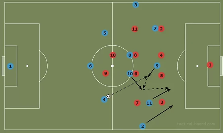 Выше показан набор пасов и движений, необходимых для завершения этой комбинации. Первое движение, которое запускает этот сценарий — нападающий слегка опускается, чтобы получить пас от центрального защитника. Вполне вероятно, что за номером девять может последовать центральный защитник, поэтому, как только он получит мяч, можно отдать пас вразрез. Если центральный защитник не выдвигается за нападающим, то сразу же после получения мяча нашим страйкером от центрального защитника номер десять должен переместиться в полуфланг, где есть пространство для получения передачи в касание от нападающего. Это быстрое движение номера десять должно позволить ему опередить своего опекуна, номера шесть, и принять пас в свободной зоне. Одновременно с этим крайний нападающий и вингбек должны совершить рывки за спину защитникам. Таким образом создается преимущество 2v1 против крайнего защитника. Это повышает вероятность того, что один из двух забежавших будет открыт для передачи от номера десять.