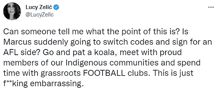 «Может ли кто-нибудь сказать мне, в чем смысл этого? Маркус вдруг собирается сменить вид спорта и подписать контракт в AFL? Иди и погладь коалу, познакомься с гордыми членами наших коренных общин, но не это. Это просто чертовски неловко».