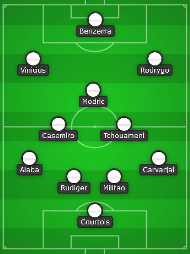 Это означает, что тренер создаст для своей команды двойную опору в полузащите. Это позволило бы иметь только одного центрального атакующего полузащитника в команде. Вот как будет выглядеть состав: Солидно? Тчуамени и Каземиро сделают "Реал" чрезвычайно трудным соперником в центре поля. Не будем забывать, что сзади есть еще новичок в центре обороны - Антонио Рюдигер.
