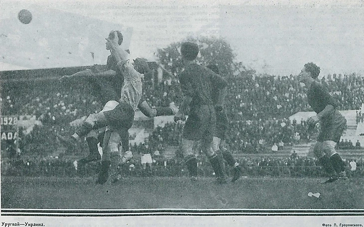 21 августа 1928 года. Финал группы союзных республик. Стадион «Динамо». Украинская ССР - Уругвай - 7:1 (3:1). Фото П. Гроховского из альбома «Спартакиада» (под общей редакцией В. Михельса, Москва, 1928 год, издательство АО «Физкультура и спорт»)