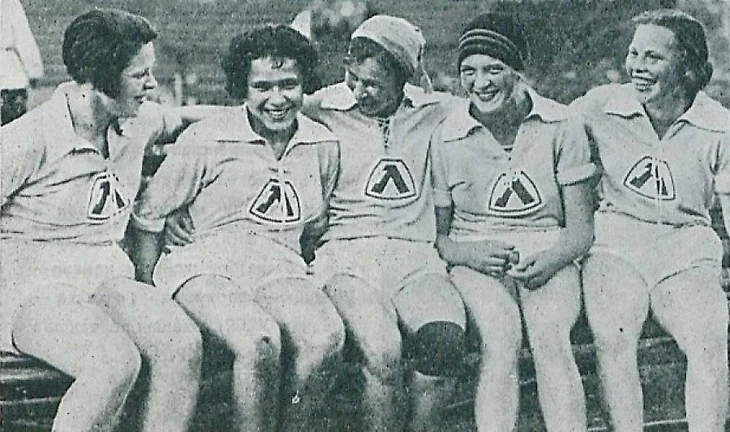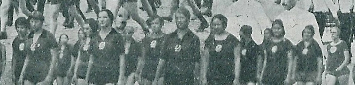 Август 1928 года. Спартакиада. Волейболистки Украинской ССР (УСРР - Українська Радянська Соціалістична Республіка). Фото из альбома «Спартакиада» (под общей редакцией В. Михельса, Москва, 1928 год, издательство АО «Физкультура и спорт»)