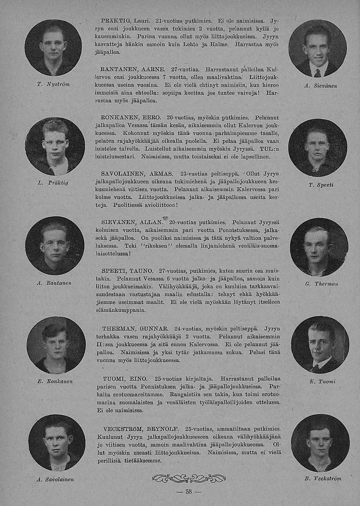 1928 года. Сборная Финляндии TUL: левый столбик (сверху вниз) - Тойво Нюстрём (Toivo Nyström), нападающий, «Веса» (Тёёлё, Хельсинки), 26 лет, слесарь; Лаури Пректиг (Lauri Präktig), полузащитник, «Юрю» (Хельсинки), 21 год, слесарь; Аарне Рантанен (Aarne Rantanen), вратарь, «Куллерво» (Хельсинки), 27 лет; Эро Ронканен (Eero Ronkanen), нападающий, «Веса» (Тёёлё, Хельсинки), 20 лет, слесарь; Армас Саволайнен (Armas Savolainen), полузащитник, «Юрю» (Хельсинки), 23 года, жестянщик. Правый столбик (сверху вниз): Аллан Сиевянен (Allan Sievänen), «Юрю» (Хельсинки), 20 лет, слесарь; Тауно Спети (Tauno Speeti), нападающий, «Веса» (Тёёлё, Хельсинки), 27 лет, слесарь; Гуннар Терман (Gunnar Therman), нападающий, «Юрю» (Хельсинки), 24 года, жестянщик; Эйно Туоми (Eino Tuomi), «Поннистус» (Хельсинки), 25 лет, работник типографии; Брюнолф Векстрём (Brynolf Veckström), нападающий, «Юрю» (Хельсинки), 25 лет, слесарь (журнал «Тюёвяен урхейлулехти» № 48-49 от 7 декабря 1928 года)