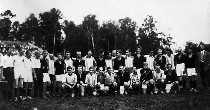 19 августа 1928 года. Полуфинал группы союзных республик. Стадион «Динамо». Уругвай - Финляндия - 3:1 (2:1). Северяне в темной форме (pikabu.ru)