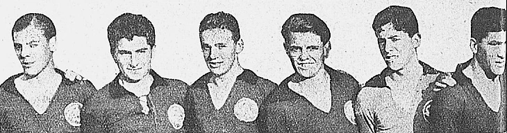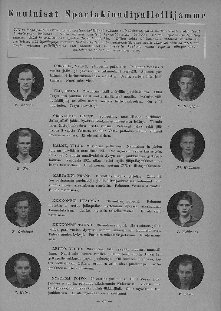 1928 года. Сборная Финляндии TUL: левый столбик (сверху вниз) - Вяйнё Фёрстен (Väinö Försten), полузащитник («лучший центральный полузащитник Финляндии»), «Веса» (Тёёлё, Хельсинки), 27 лет, слесарь; Рейно Фрии (Reino Frii), нападающий, «Юрю» (Хельсинки), 21 год, слесарь; Эрнст Грёнлунд (Ernst Grönlund), центрфорвард («признанный лидер линии атаки»), «Веса» (Тёёлё, Хельсинки), 26 лет, слесарь; Вильо Халме (Viljo Halme), вратарь, «Юрю» (Хельсинки), 21 год, слесарь. Правый столбик (сверху вниз): Франс Карягин (Frans Karjagin), защитник, «Веса» (Тёёлё, Хельсинки), 19 лет, бизнес-стажер; Хьялмар Кекконен (Hjalmar Kekkonen), «Юрю» (Хельсинки), 20 лет, штукатурщик; Тауно Кекконен (Tauno Kekkonen), «Юрю» (Хельсинки), 18 лет, штукатурщик; Вильо Лехто (Viljo Lehto), защитник, «Юрю» (Хельсинки), 23 года, каменщик (журнал «Тюёвяен урхейлулехти» № 48-49 от 7 декабря 1928 года)
