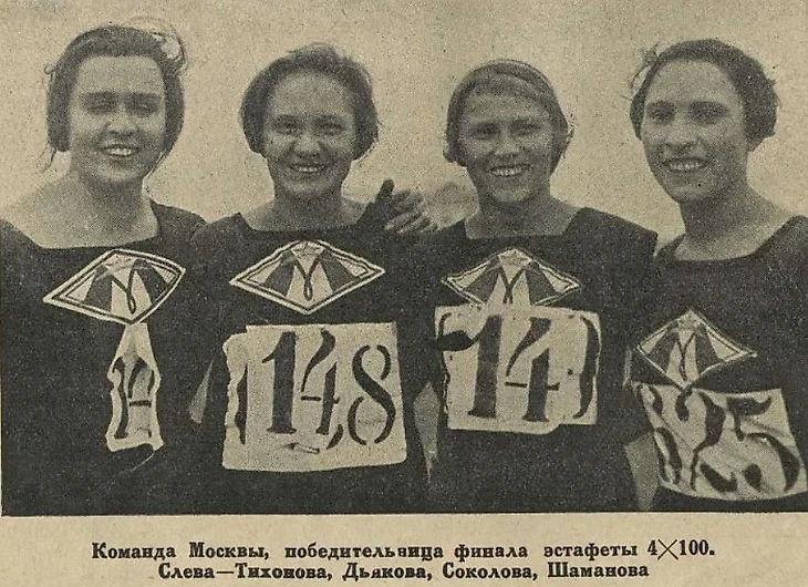Август 1928 года. Спартакиада. Сборная Москвы, победившая в женской эстафете 4 х 100 метров ( «Физкультура и спорт» № 35 за 1928 год)