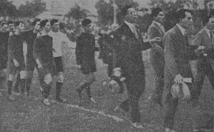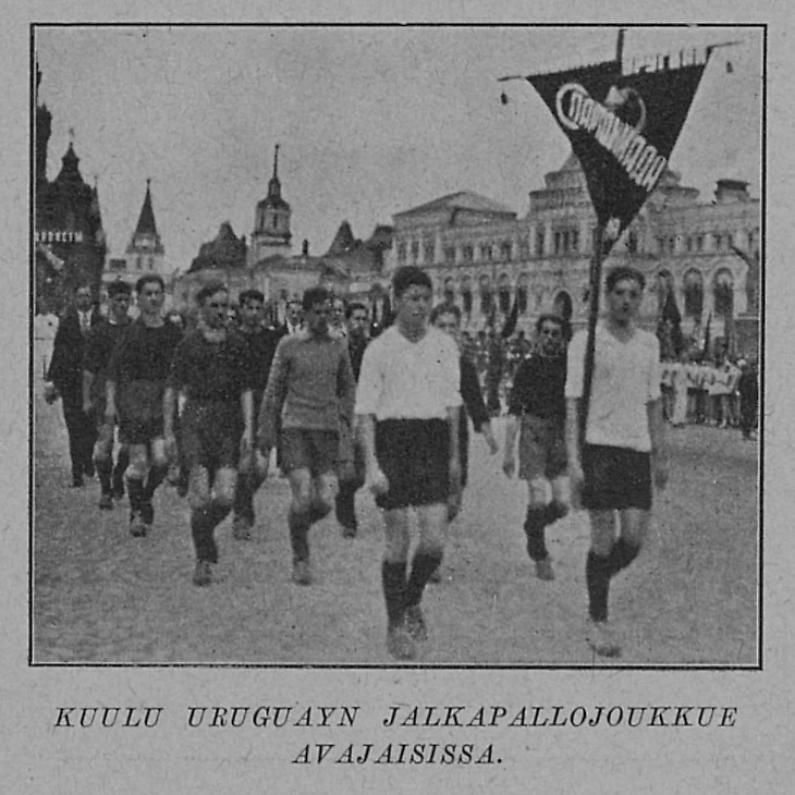 11 августа 1928 года. Москва. Самарский переулок, 22. Cтадион Cоюза совторгслужащих. Уругвай - Центральный промышленный район (ЦПР) - 3:1. «Уругвайцы обходят стадион и поют «Интернационал» (еженедельный журнал «Тюёвяен урхейлулехти» № 37-38 от 13 сентября 1928 года)
