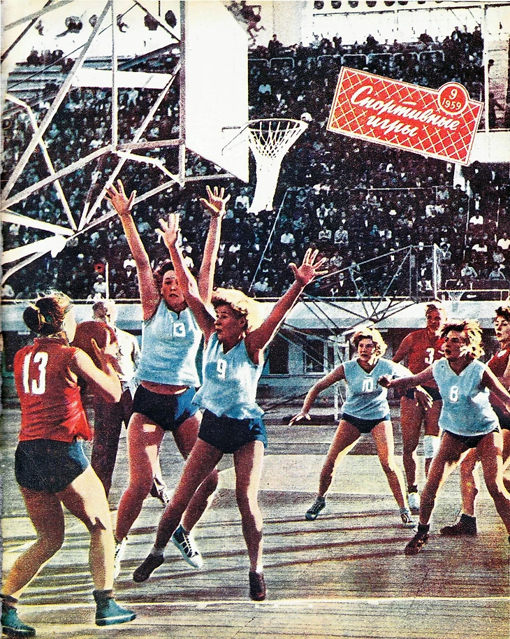 Август 1959 года. II Летняя Спартакиада народов СССР. Баскетбол. Женщины. Финальный турнир. Москва - Ленинград - 54:38 (фото В. Гребнева с обложки журнала «Спортивные игры» № 9 за сентябрь 1959 года / lib.sportedu.ru)