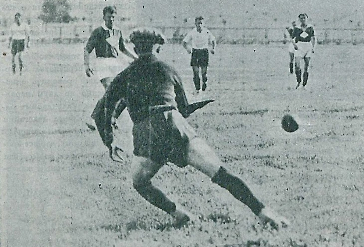 13 августа 1928 года. Спартакиада. Стадион химиков (Новодевичья набережная, 11). Швейцария - Центральный земледельческий район (ЦЗР) - 7:1 Фото М. Гальперина из альбома «Спартакиада» (под общей редакцией В. Михельса, Москва, 1928 год, издательство АО «Физкультура и спорт»)