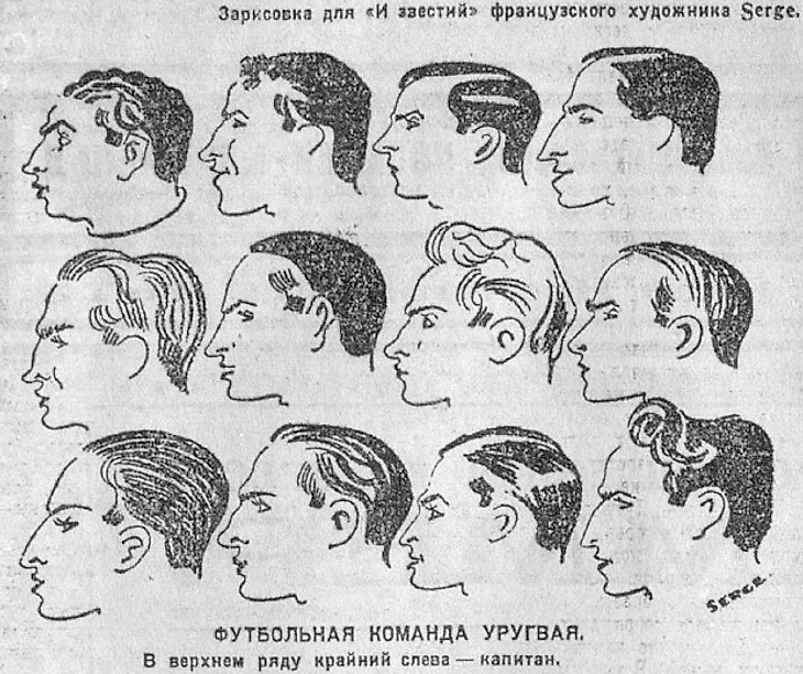Август 1928 года. Спартакиадная сборная Уругвая ФКС. Рисунок художника Serge (Франция) из газеты «Известия ЦИК СССР и ВЦИК» от 5 августа 1928 года