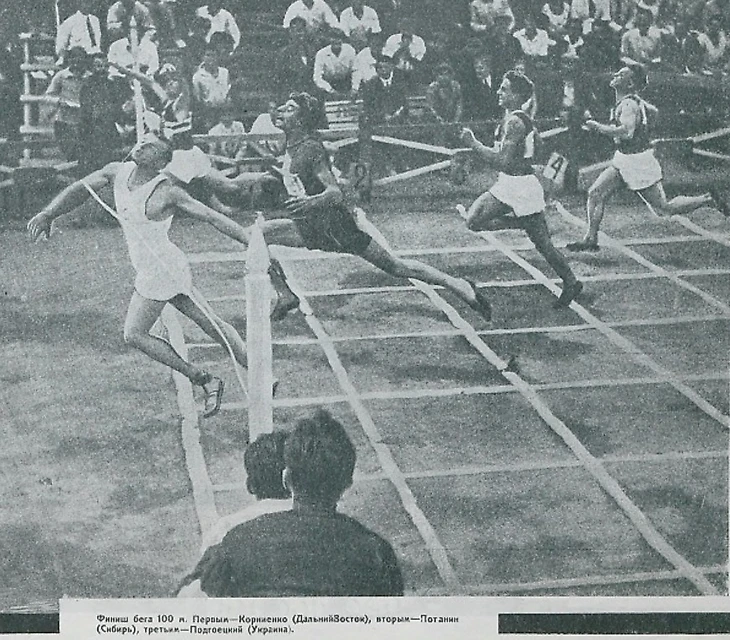 19 августа 1928 год. Спартакиада. Стадион имени Томского Союза пищевиков. Финиш финального забега на 100 метров у мужчин, победителем в котором стал Тимофей Корниенко (Дальний Восток). Фото из альбома «Спартакиада» (под общей редакцией В. Михельса, Москва, 1928 год, издательство АО «Физкультура и спорт»)