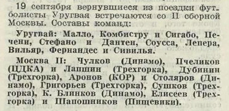 19 сентября 1928 года. Состав сборной Уругвай на матч со второй сборной Москвы (еженедельный журнал «Физкультура и спорт» № 38 от 22 сентября 1928 года)