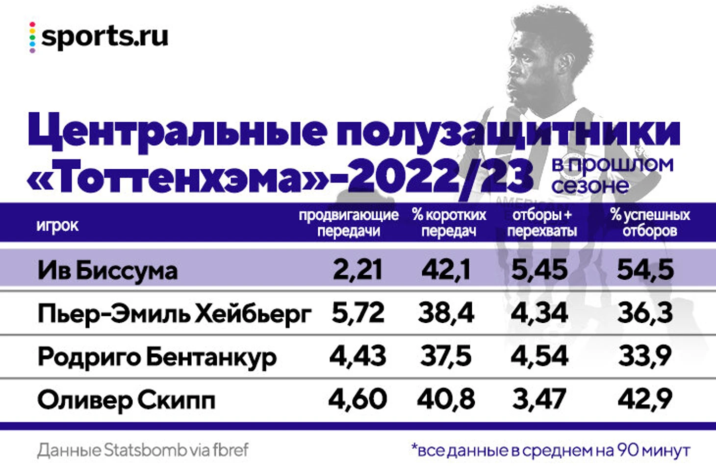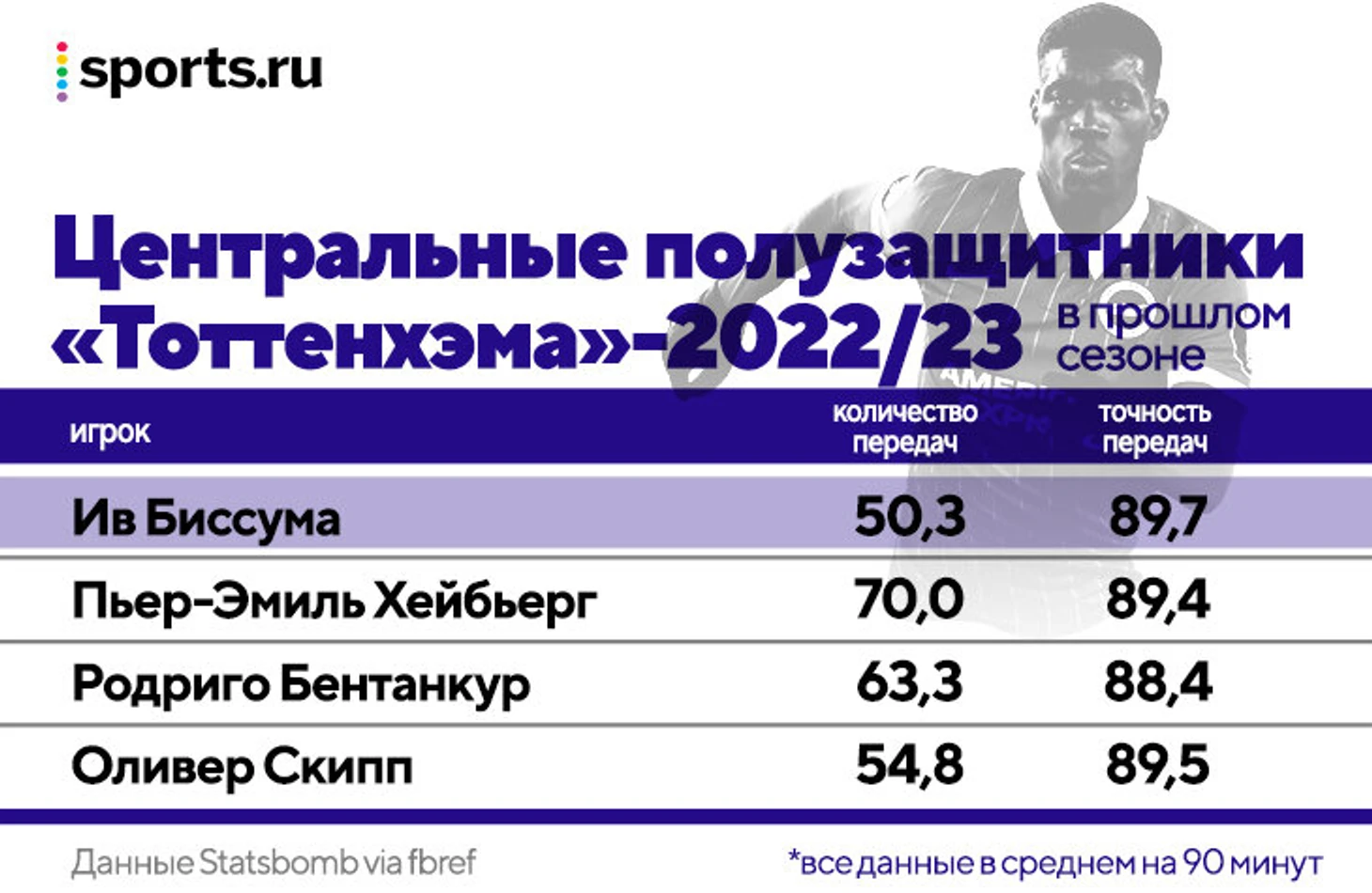 Несмотря на то, что Биссума играл опорника в «Брайтоне» и выдавал большой объем работы, ему потребуется адаптация к системе Конте и по части действий с мячом, и по игре без мяча. «Брайтон» играл смело и активно прессинговал, много владел мячом: в прошлом сезоне АПЛ он был 4-м по владению (54,2%), даже выше «Тоттенхэма» (8-е с 51,9%). Но у «Брайтона» самые пасующие игроки – защитники, а у «Тоттенхэма» – Хейбьерг. Бентанкур на четвертом месте. В пересчете на 90 минут игроки «шпор» пасовали значительно чаще Биссума.