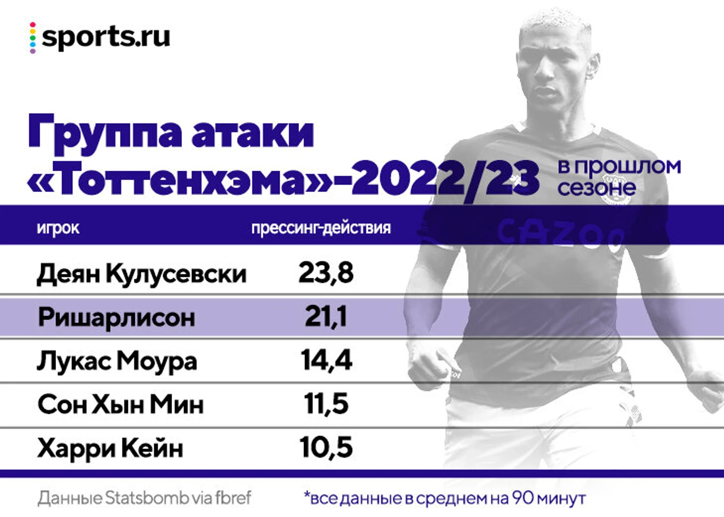 Ришарлисон отлично подходит и под описание нападающего в системе Конте, и может сыграть на любой позиции. Таким образом у Конте 5 нападающих на три позиции и очень разные по функционалу игроки. Лукас лучше тащит мяч, Ришарлисон – мощнее, атлетичнее и больше нацелен на завершение, а Кулусевски может отдать тонкую передачу. Эта троица очень работоспособна и дает «Тоттенхэму» еще одну опцию: прессинг с высокой интенсивностью. Вряд ли этот вариант будет часто встречаться, Сон и Кейн слишком важны для команды, но важно иметь такую возможность.
