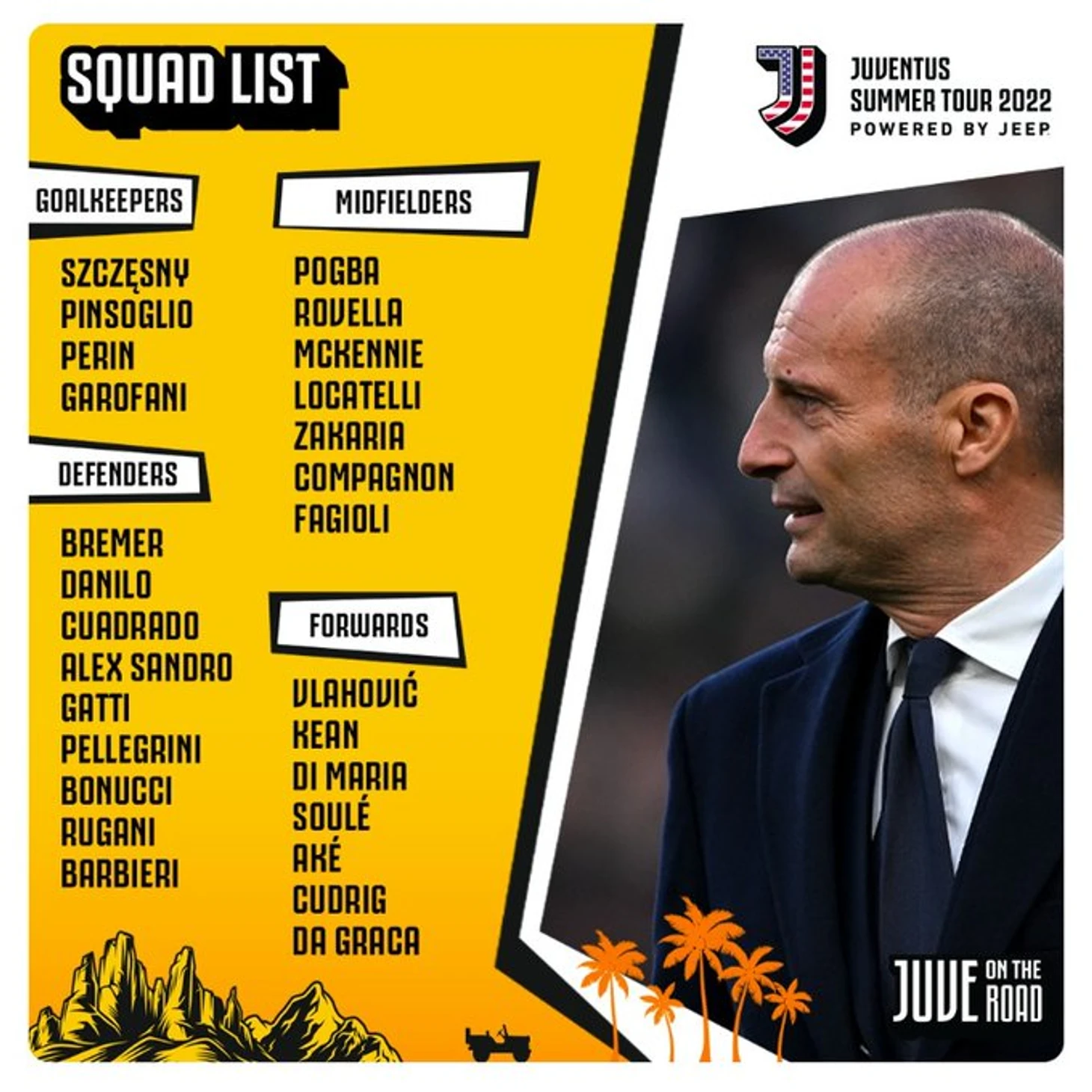 Федерико Кьеза, Маттиа Де Шильо, Кайо Жорже, Артур отсутствуют по медицинским показателям. Марко Пьяца и Аарон Рэмзи готовятся к трансферам, а Адриен Рабьо по данным СМИ отказался от обязательной в США вакцинации.