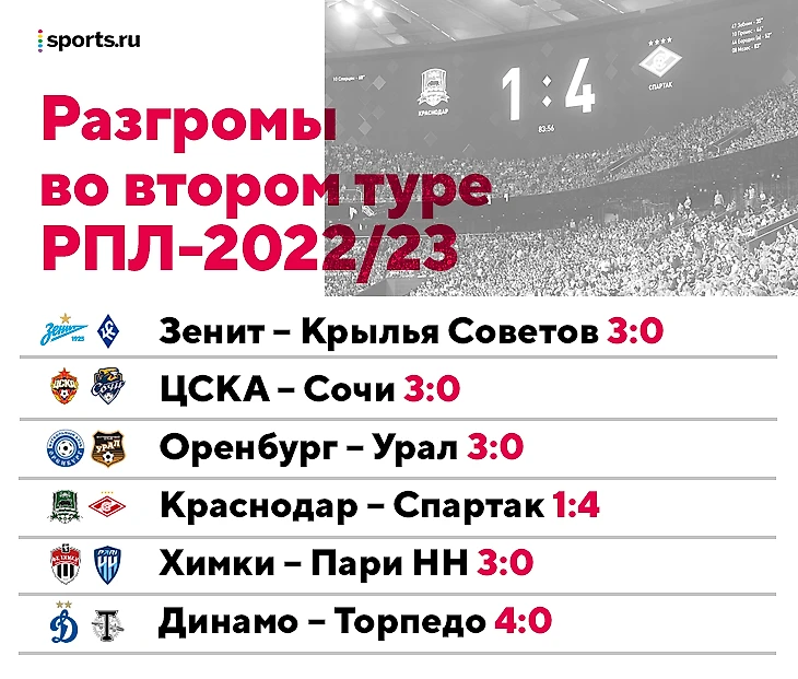 РПЛ-2022/23 уже во втором туре подарила рекорд по разгромам – так закончились сразу шесть матчей из восьми.