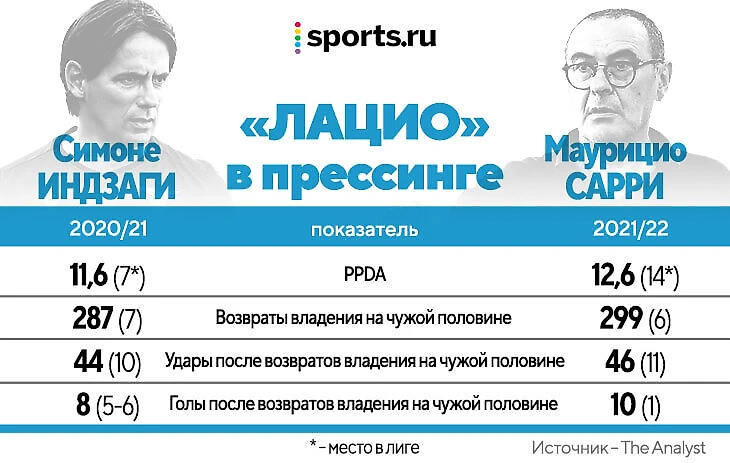 Показатели эффективности прессинга не указывали на значительный прогресс. Да, «Лацио» больше всех в лиге забил после возвратов владения на чужой половине, но это связано скорее с качественной реализацией. Количество самих возвратов и ударов после них осталось примерно на том же уровне, что и при Индзаги в позапрошлом сезоне.