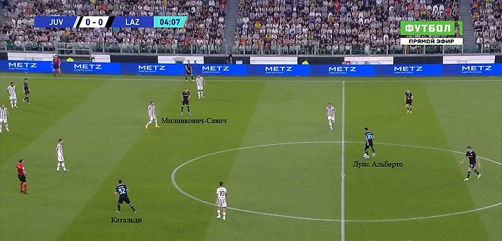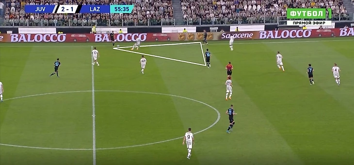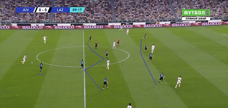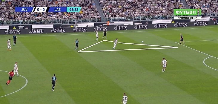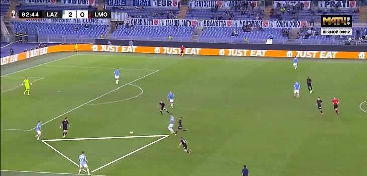 Если «Лацио» пытался под давлением выйти через фланги, центральный и фланговый защитники вместе с восьмеркой или опорником образовывали треугольник. Такое расположение позволяло иметь хотя бы один вариант для паса и в нужный момент разыграть короткую комбинацию для сохранения владения на своей половине.