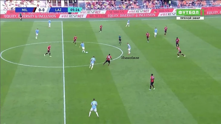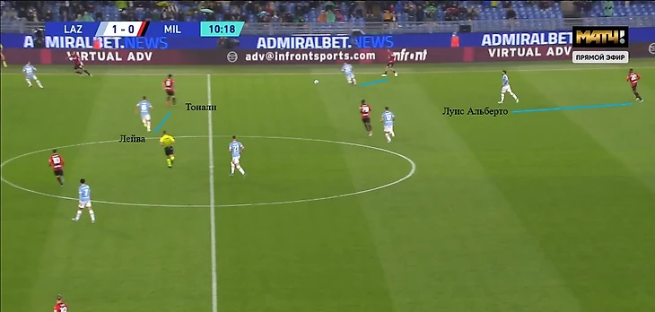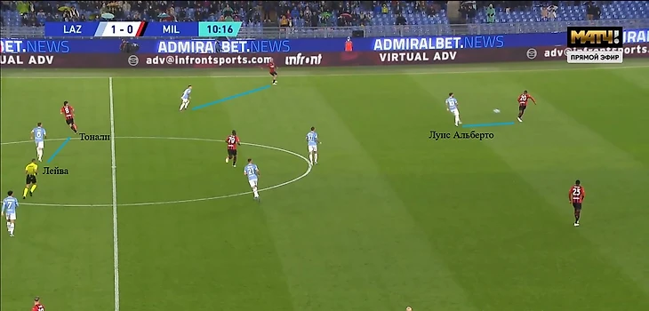 Например, в игре с «Миланом» Луис Альберто выдвигался на Калулу, а в этот момент в правом полуфланге открывался Тонали. Сандро хотел принять передачу от Калабрии, но Лейва видел это и сместился ближе к нему.
