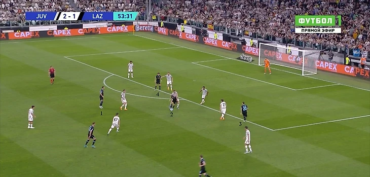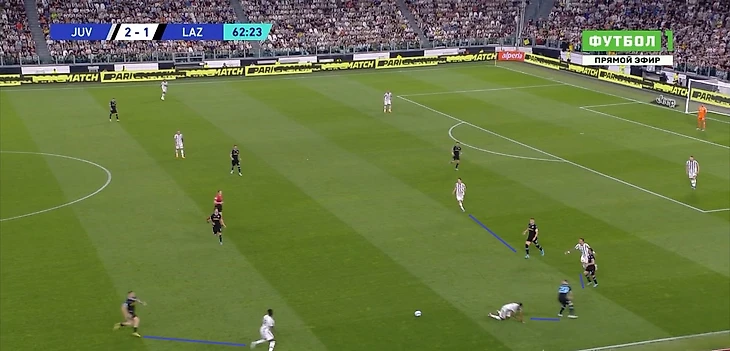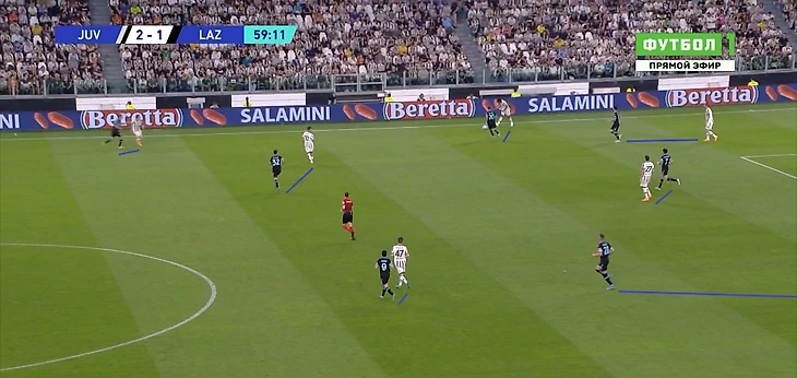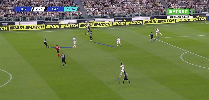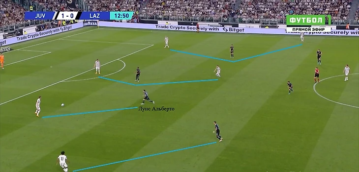 Когда же опорник «Лацио» уже сместился сильно правее или левее и оставил зону в центре, появлялась возможность напрямую или через партнера отдать передачу ему за спину и обострить ситуацию. Требовалась подстраховка от ближней восьмерки или вмешательство центрального защитника с рывком из линии защиты на перехват.