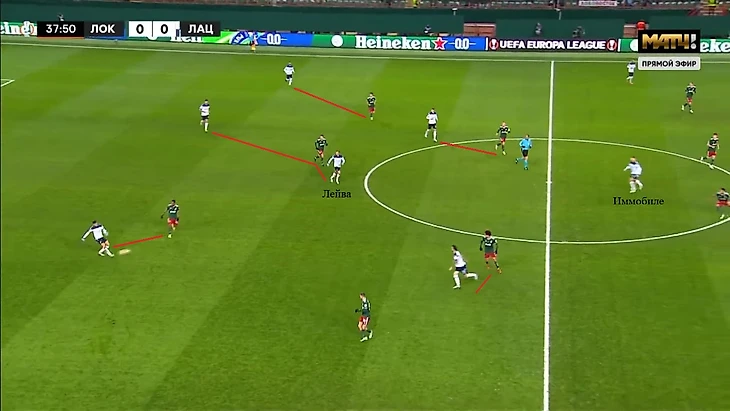 Смещения Иммобиле приносили разную пользу в зависимости от ситуации. Он мог вытянуть из линии защитника и открыть зону, куда в нужный момент врывался партнер из линии атаки или кто-то из восьмерок. Но оборонительные принципы не у всех команд предполагают выдвижение за нападающим до конца, и тогда Иммобиле предлагал себя для передачи на свободном пространстве и дальше развивал владение самостоятельно.