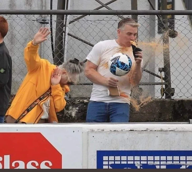 На кубковом матче между «Элгин Сити» и «Куин оф Саус» произошел знаменательный инцидент. В одного из болельщиков, который мирно примостился с едой и напитками на трибуне, попал футбольный мяч. Пикнатность ситуации, если можно это так назвать, придал фотограф, нажавший затвор в самый нужный момент.