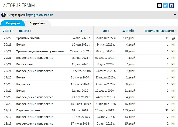 2. Прикреплю картинку с историей травм. Добавлю, что одним из своих любимых защитников называл Самюэля Умтити.