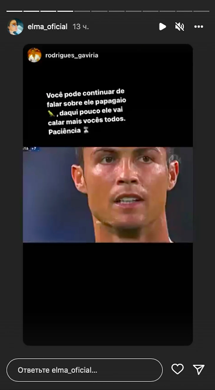 В соцсетях активничает не только сам Криштиану. Его сестра Элма Авейру репостнула видео с голом Роналду за «Реал» в финале ЛЧ-2017, подписав его так: «Можете продолжать болтать как попугаи, через некоторое время он заставит вас всех молчать. Терпение».